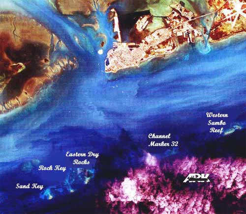 The future site for the Vandenberg is about 6 miles south of Key West, near Hawk's Channel marker #32, and between Western Sambo and Sand Key. The keel will lie at 140 feet; tops of the superstructure and antennas will be at 40 feet.