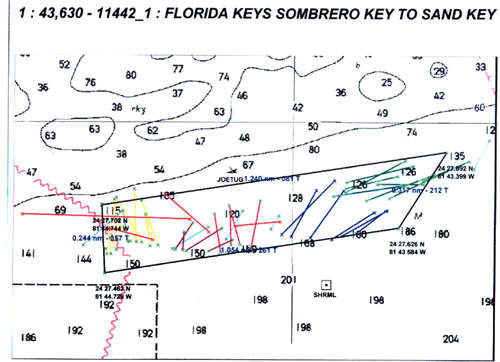 Part of the permitting process for the Vandenberg project involved conduction survey dives of the proposed site. Bottom contour and composition, absence of significant marine ecosystem and coral growth, and absence of submerged cultural resources was confirmed. The colored lines represent individual dives.