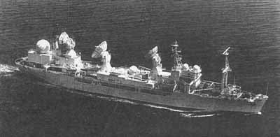 In this ship we see the most peculiar silhouette that any vessel ever displayed. In part that is due to the forty-foot high dish antennas. They can literally collect millions of items of information about a missile in its final two or three minutes of flight between its reentry into our atmosphere and its impact.